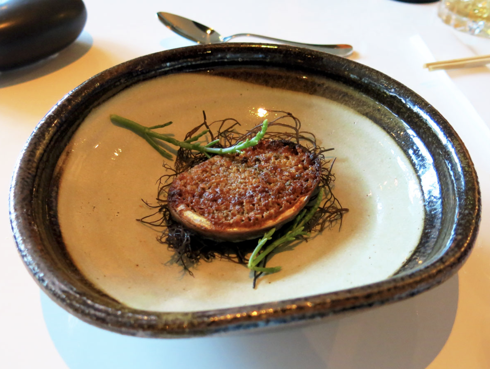 Back in the dining room, an appetizer is billed as popcorn soup with burnt butter ($12), a golden corn chowder poured over a small bowl of popcorn at the table for added flourish. Another standout entrée was a stone hotpot of seafood, lobster, fish and shrimp slow-cooked in a lime- and herb-scented bisque ($59).