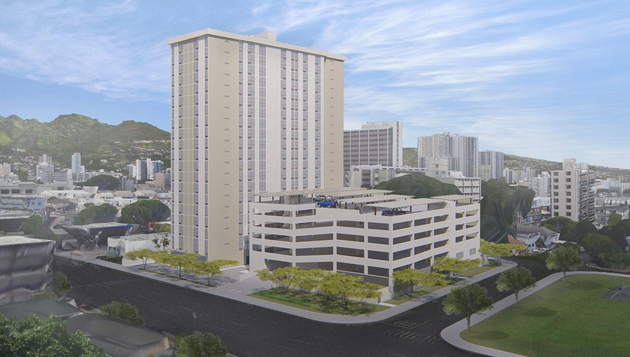 Built to meet the needs of moderate- to lower- income residents in urban Honolulu, the 200-unit property features bike storage, laundry and recreation rooms, large floor-to-ceiling glass windows, Energy Star appliances, photovoltaic panels and batteries providing 60% of the building’s energy needs, EV car sharing and charging stations, and electric bike and scooters available for residents.